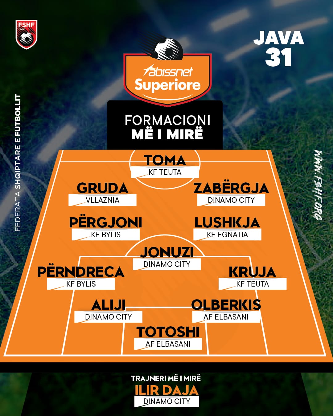 Pas përfundimit të javës së 31-të të kampionatit “Abissnet Superiore”, trajnerët e ekipeve kombëtare kanë përzgjedhur 11-shen dhe trajnerin më të spikatur të kësaj jave. Portieri më i mirë i javës është përzgjedhur Klevi Totoshi i skuadrës së AF Elbasanit, ndërsa vija e mbrojtjes përbëhet nga katërshja: Fabjan Përndreca (KF Bylis), Naser Aliji (Dinamo City), Sigitas Olberkis (AF Elbasani) dhe Arsid Kruja (Teuta).