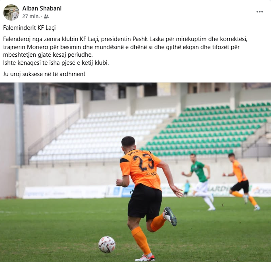 Falenderoj nga zemra klubin KF Laçi, presidentin Pashk Laska për mirëkuptim dhe korrektësi, trajnerin Moriero për besimin dhe mundësinë e dhënë si dhe gjithë ekipin dhe tifozët për mbështetjen gjatë kësaj periudhe.