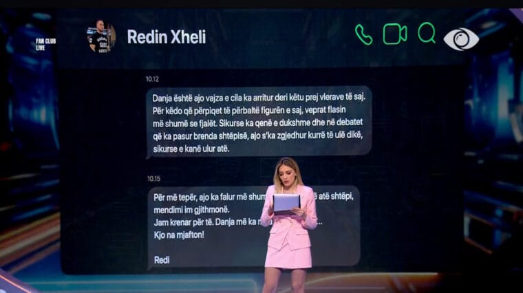 Ndërkohë, në studio u lexua një mesazh i partnerit të Danjës, Redit, i cili reagoi pas deklaratave të Aldos, duke i dalë në mbrojtje vajzës që ai dashuron.