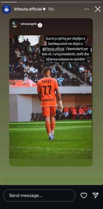 “Dua të njoftoj për mbylljen e bashkëpunimit me ekipin e Teutës. Faleminderit për këtë vit. I uroj presidentit, stafit dhe lojtarëve suksese në vazhdim”, shkruan Tafas në “InstaStory”. Ky postimi është shpërndarë edhe në profilin zyrtar të durrsakëve.