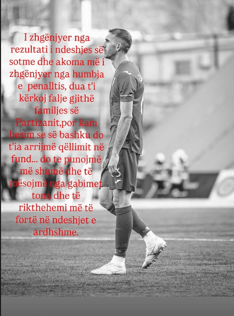 David Domgjoni humbi penalltinë, që mund t’i jepte Partizanit një barazim në derbin përballë Dinamos. Ishte minuta e 95-të, kur mbrojtësi u ndal nga traversa. Për këtë, Domgjoni ka reaguar në rrjetet sociale. Me mesazhin e tij i kërkon falje familjes së kuqe, por shton se ka besim që do të arrihet qëllimi në fund.