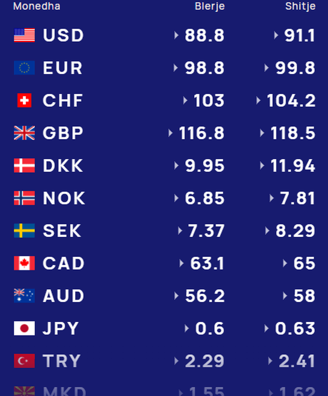 Për kursin e monedhave të tjera shihni tabelën e mëposhtme: