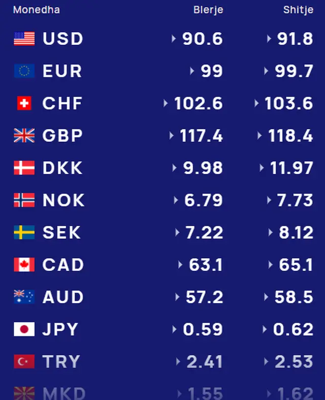 Për kursin e monedhave të tjera shihni tabelën e mëposhtme: