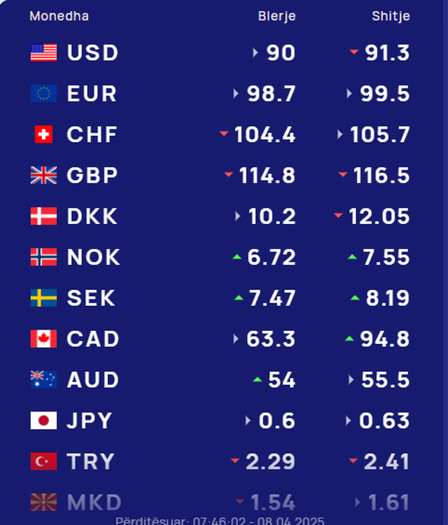 Për kursin e monedhave të tjera shihni tabelën e mëposhtme: