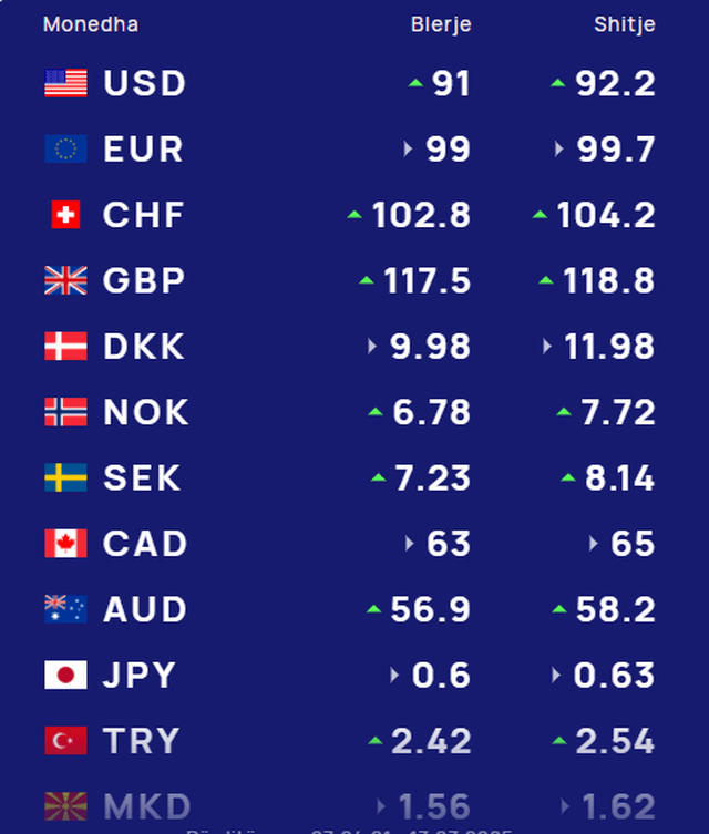 Për kursin e monedhave të tjera shihni tabelën e mëposhtme: