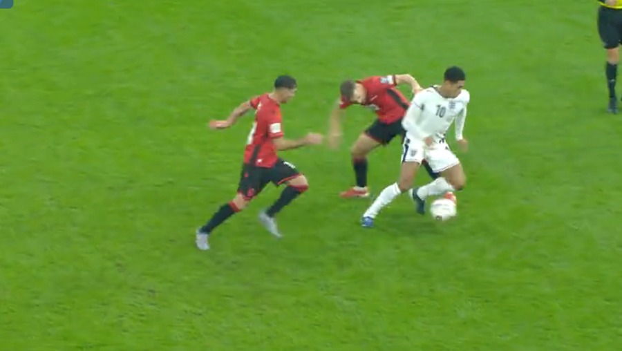 14′- Ylber Ramadani ndeshkohet me karton te verdhe, mesfushori ben nje nderhyrje te gabuar ndaj Harry Kane.