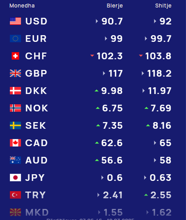 Për kursin e monedhave të tjera mund të shihni tabelën e mëposhtme: