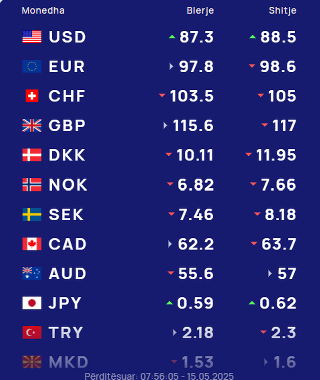 Për kursin e monedhave të tjera shihni tabelën e mëposhtme: