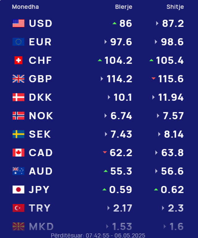 Për kursin e monedhave të tjera shihni tabelën e mëposhtme: