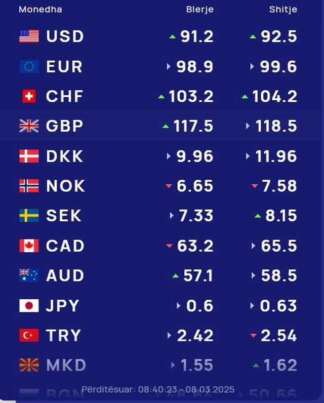 Për kursin e monedhave të tjera shihni tabelën e mëposhtme: