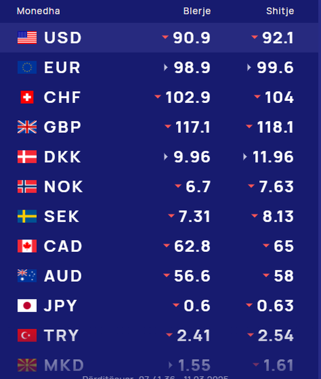 Për kursin e monedhave të tjera shihni tabelën e mëposhtme: