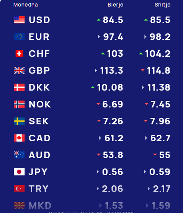 Për kursin e monedhave të tjera shihni tabelën e mëposhtme: