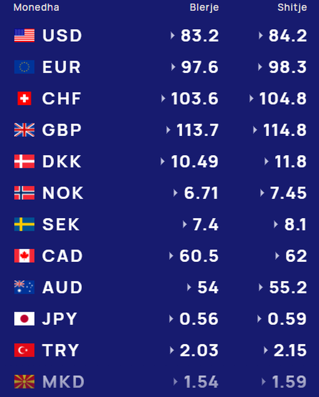 Për kursin e monedhave të tjera shihni tabelën e mëposhtme: