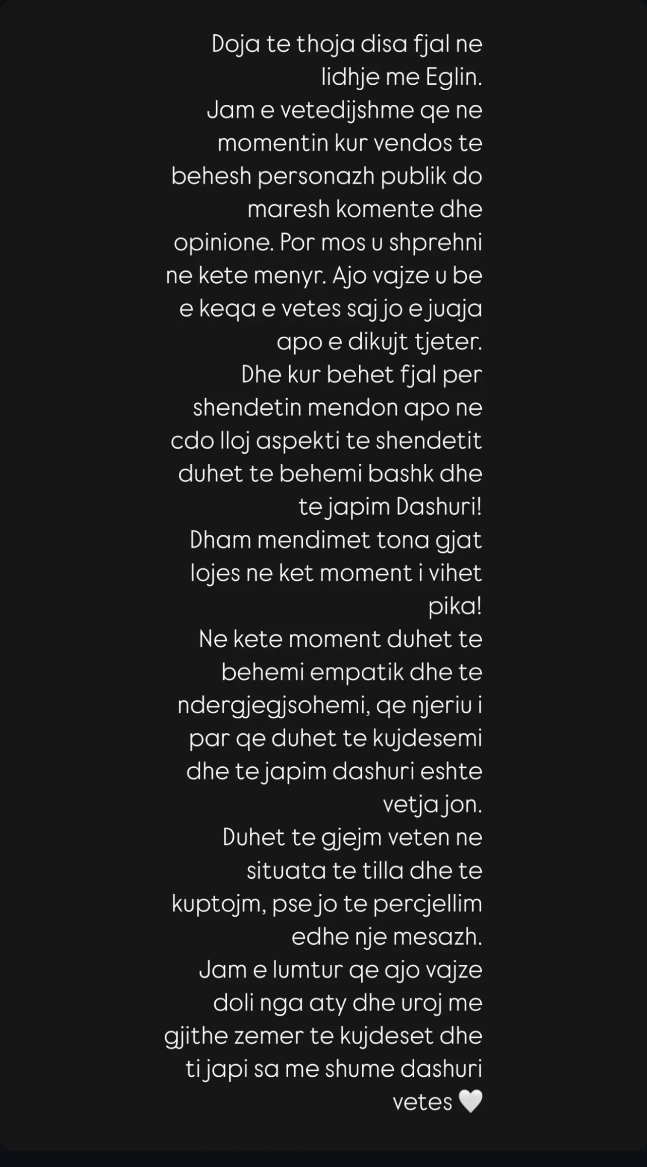 Doja të thoja disa fjalë në lidhje me Eglin. Jam e vetëdijshme që në momentin kur vendos të bëhesh personazh publik do marrësh komente dhe opinione. Por mos u shprehni në këtë mënyrë. Ajo vajzë u bë e keqja e vetes së saj, jo e juaja apo e dikujt tjetër.