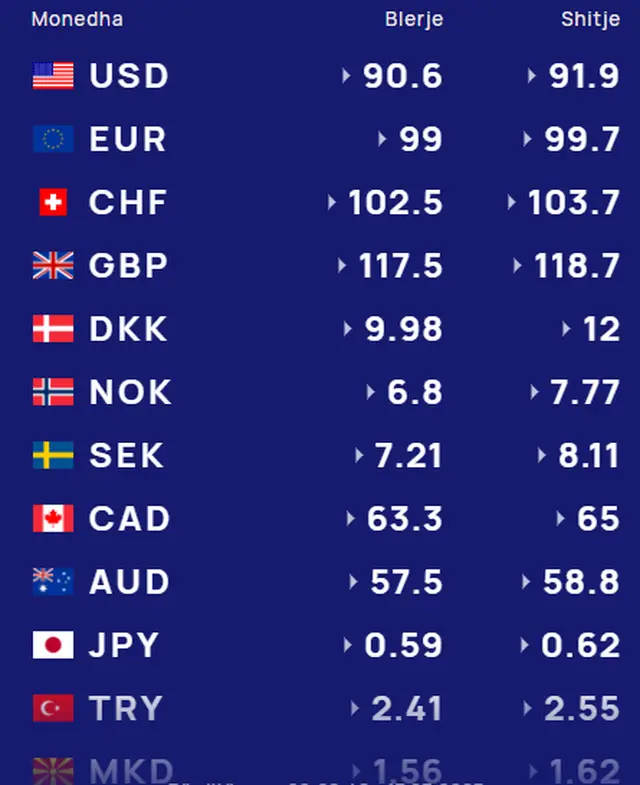Për kursin e monedhave të tjera shihni tabelën e mëposhtme: