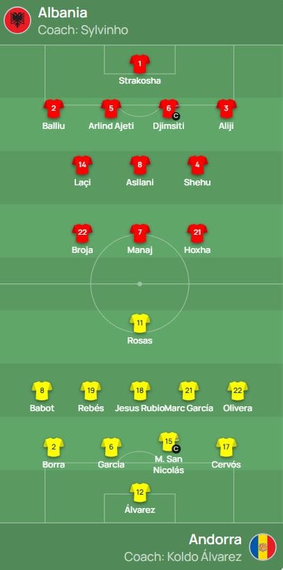 Shqipëria, trajneri Silvinjo ka bërë zgjedhjet e tij, duke provuar ndryshime të mëdha. Trajneri nuk ka ndryshuar prapavijën e kuqezinjve në krahasim me ndeshjen me Anglinë por ka bërë një lëvizje në mesfushë, duke larguar Ramadanin për t’i bërë vend debutuesit Shehu. Ndërkohë në sulm nuk është asnjë nga titullarët e ndeshjes me Anglinë, pasi në krahë janë Hoxha dhe Broja, me Manajn në qendër të sulmit.